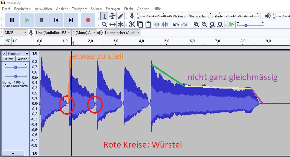 Man sieht an der nachfolgenden Illustration, dass ich bei der Aufnahme noch nicht ganz eingeblasen war, die Tonanfänge sind zu knallig (im Detail sieht man ein kleines „Würstel“ am Tonanfang und ein zu steiler Beginn, und die Ganze Note entspannt auch nicht gleichmäßig, sondern bleibt eine Wurst, allerdings ist es auch eine Vierschlagnote.